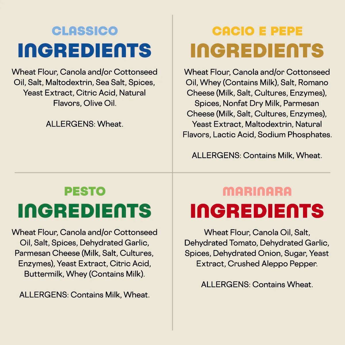 Variety of flavors in single serve is a great way to try them .. They are full bags, light and airy product !! Classico was 1st, Pesto 2nd, Cacio de pepe 3rd, Marinara 4th